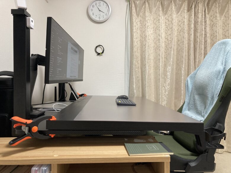画像のように天板を購入してクランプで固定しただけの簡単な仕組みですがこれが一番快適です。