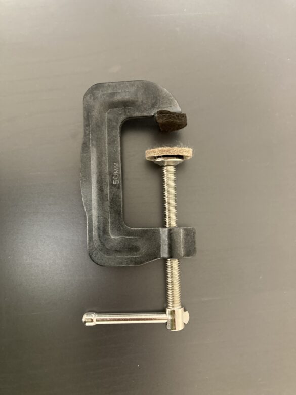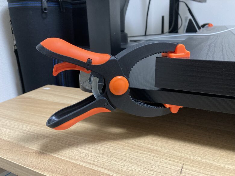 こちらで紹介しているクランプは厚さ5.3cmまでは取り付け確認しています。元の天板と新しく購入した天板の厚さの合計がはっきりしてからクランプを購入することをおすすめします。