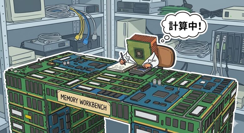 メモリが作業机、CPUがその机で作業する人。「広い机で仕事の早い人が作業すれば作業は早く終わるよね」というイメージです。
